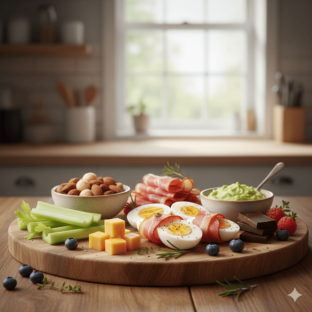 Privilégie les bonnes graisses (avocat, noix, poissons gras), les protéines de qualité (œufs, poulet, saumon) et les légumes verts riches en fibres.