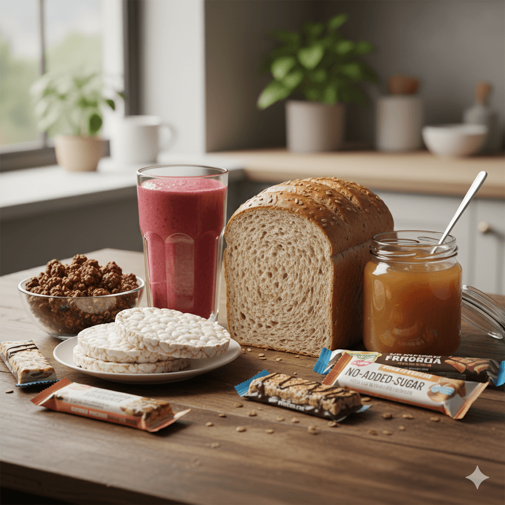 Barres, pains industriels, et snacks faibles en glucides souvent remplis d'additifs et de sucre caché.