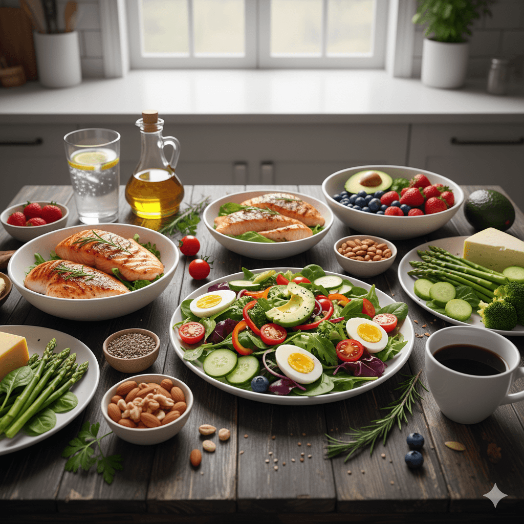 Très faible en glucides (moins de 50 g/jour) → Proche du keto, mais sans obligation d’entrer dans une cétose stricte.